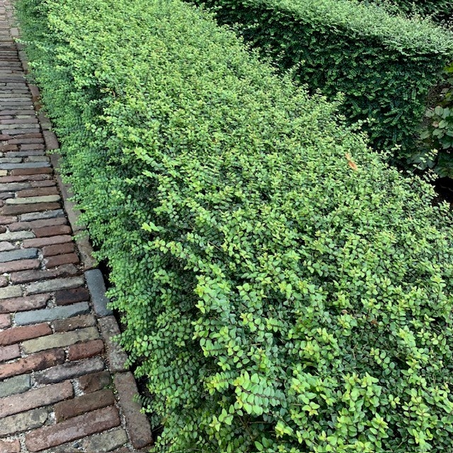 Lonicera nitida 'Maigrun': Kleine groenblijvende struik met geelgroene bladeren. Trekt vlinders aan. Geschikt als haag.
