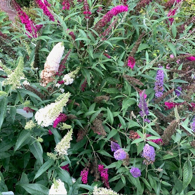 De Vlinderstruik - Buddleja davidii ‘Tricolor’ bloeit roze, wit en blauw in juli, augustus, september, oktober met witte bloemen en heeft groen blad.Lees meer